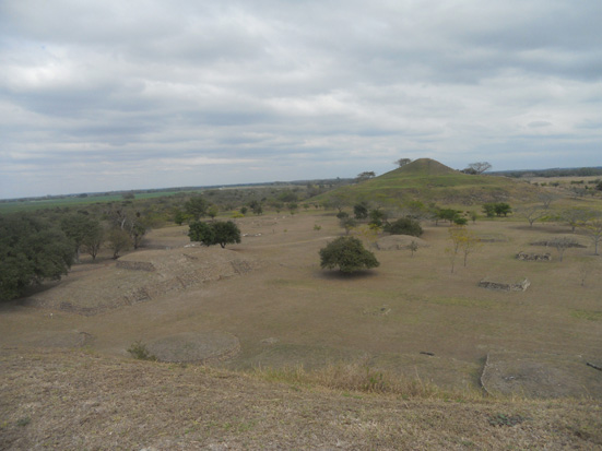 Vista del sitio arqueológico de Tamtoc desde uno de los tres montículos de más de cien metros de altura, en la foto se puede observar otro de los montículos y basamentos de edificaciones de la plaza principal de Tamtoc.