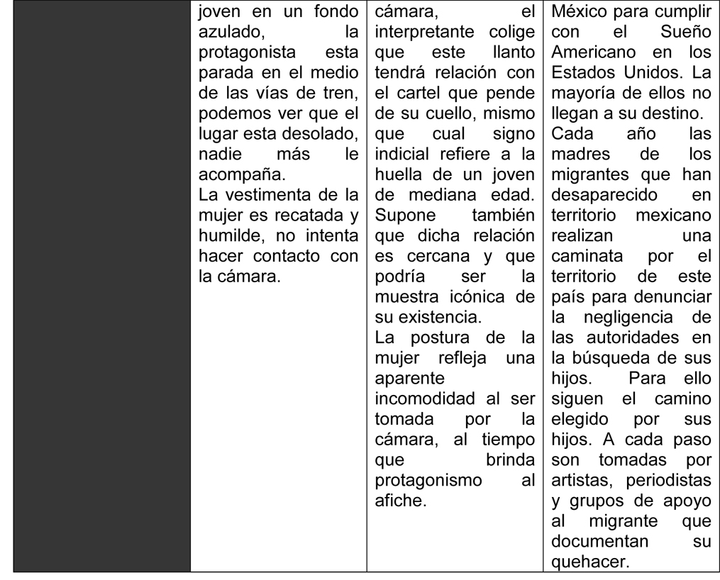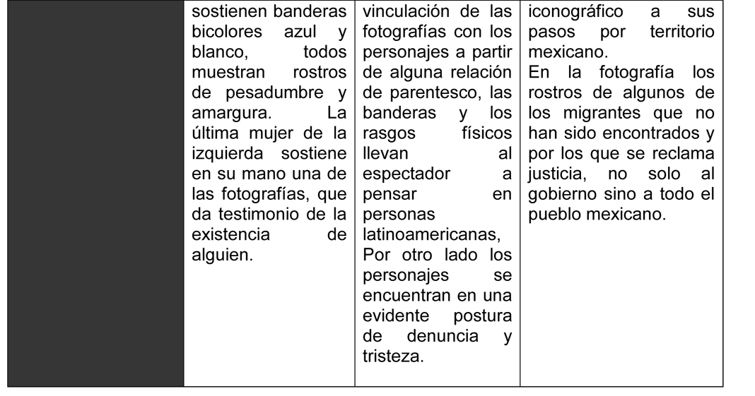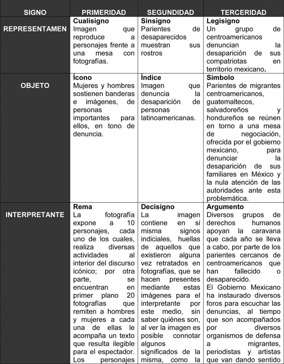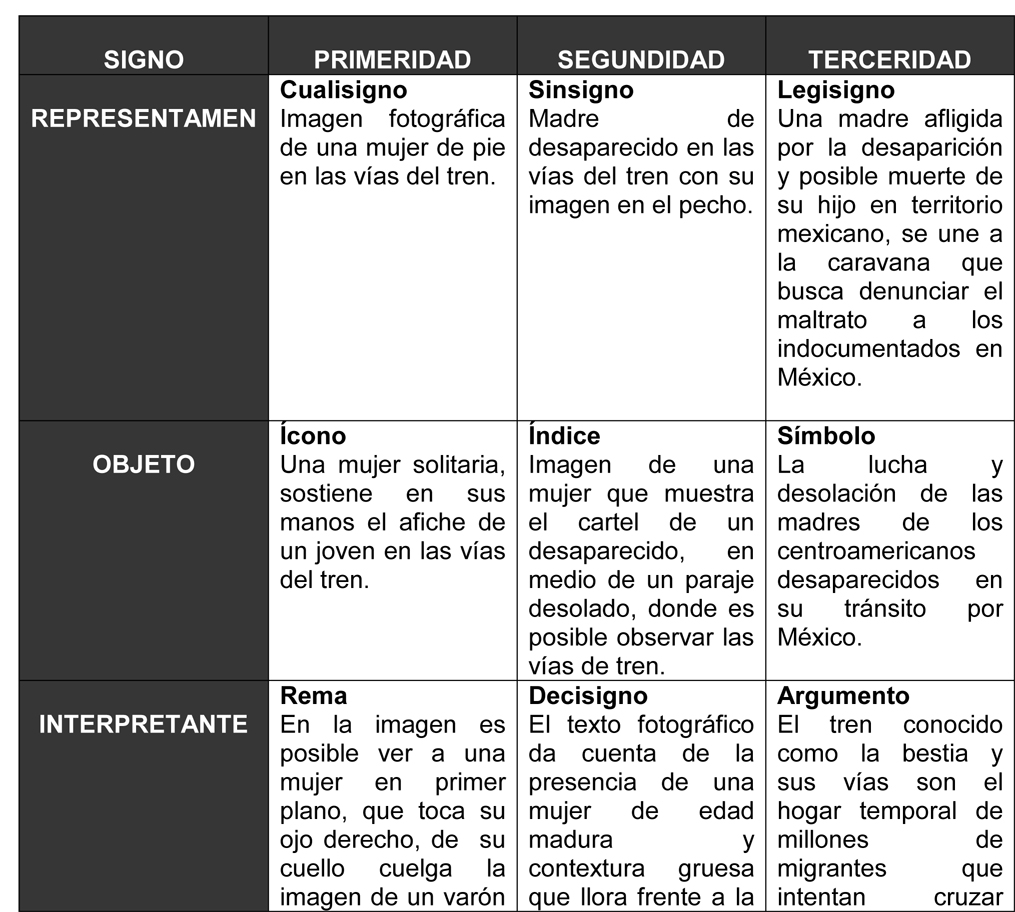 Este análisis vincula dos temas de suma importancia: por un lado, la desaparición de los migrantes centroamericanos en tránsito por México, por el otro, los estudios sobre interpretación de la imagen desde la perspectiva semiótica, específicamente a partir del pensamiento de Charles S. Peirce acerca del signo y su interpretación.